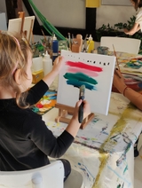 Geniální relax po náročném dni, dostali jsme akrylové barvy, milion štetců, barev, špachtlí... je možné se vybláznit. Je to spíš asi pro dospělé, osobně jsem půlku kurzy jen patlal a patlal bez myšlenek, na konci jsem se zamyslel, udělal jednu tlustou čáru oranžovou a mám geniální abstraktní obraz! :)))