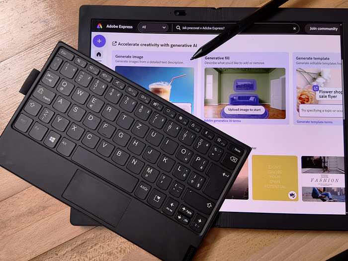 K práci s Adobe Express stačí běžný počítač s přístupem k internetu, protože služba běží přes webové rozhraní.