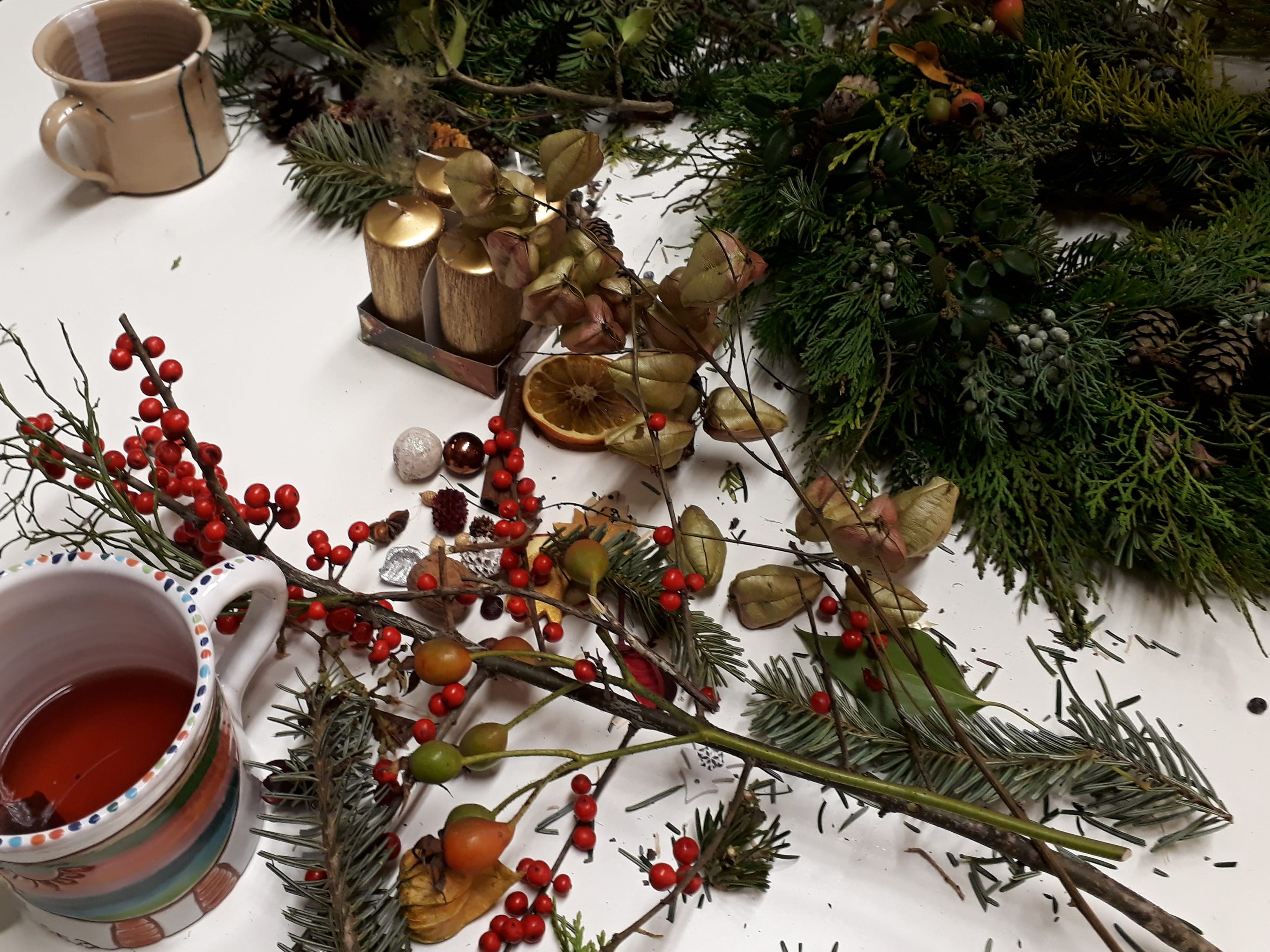 V ceně kurzu: potřebný materiál na 1 věnec – slaměný korpus, chvojí, materiál a přírodniny na zdobení, bodce na svíčky, lepidla, lektorské vedení, káva, čaj