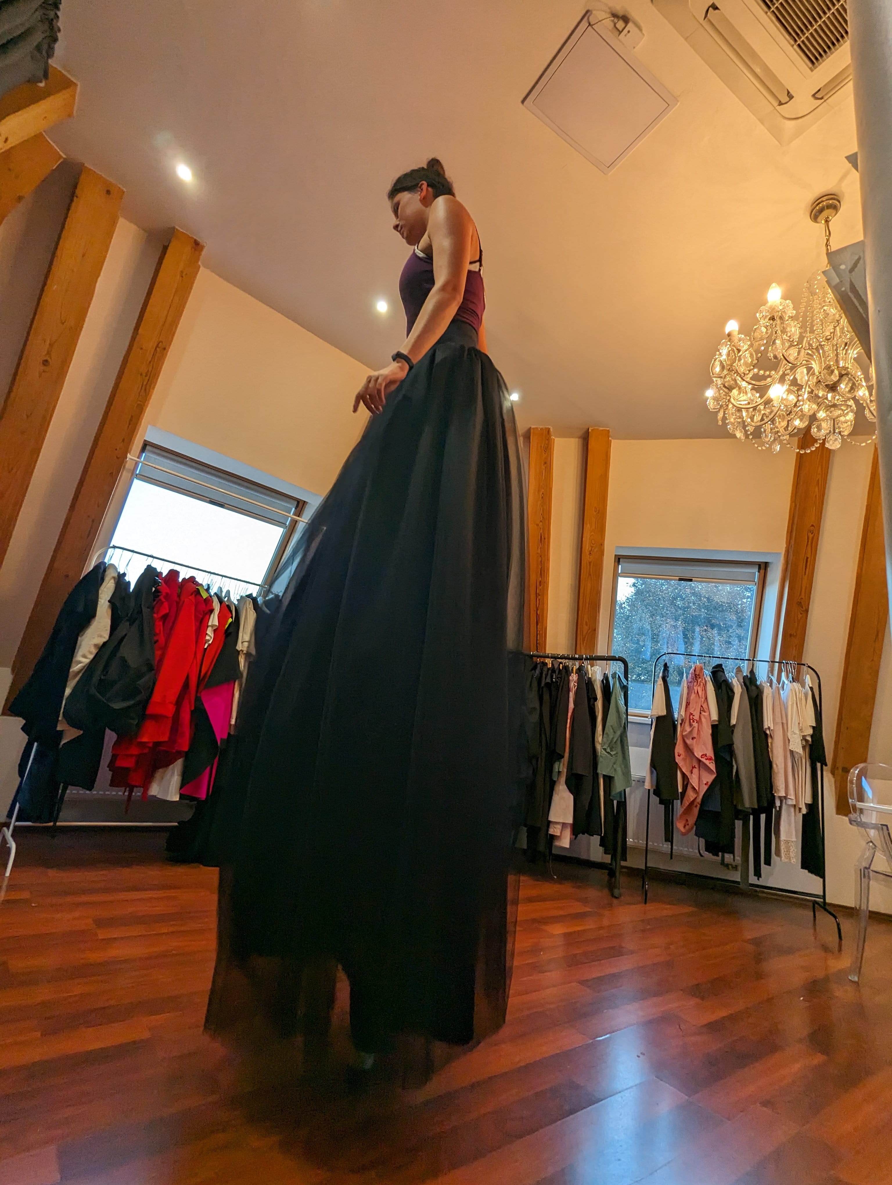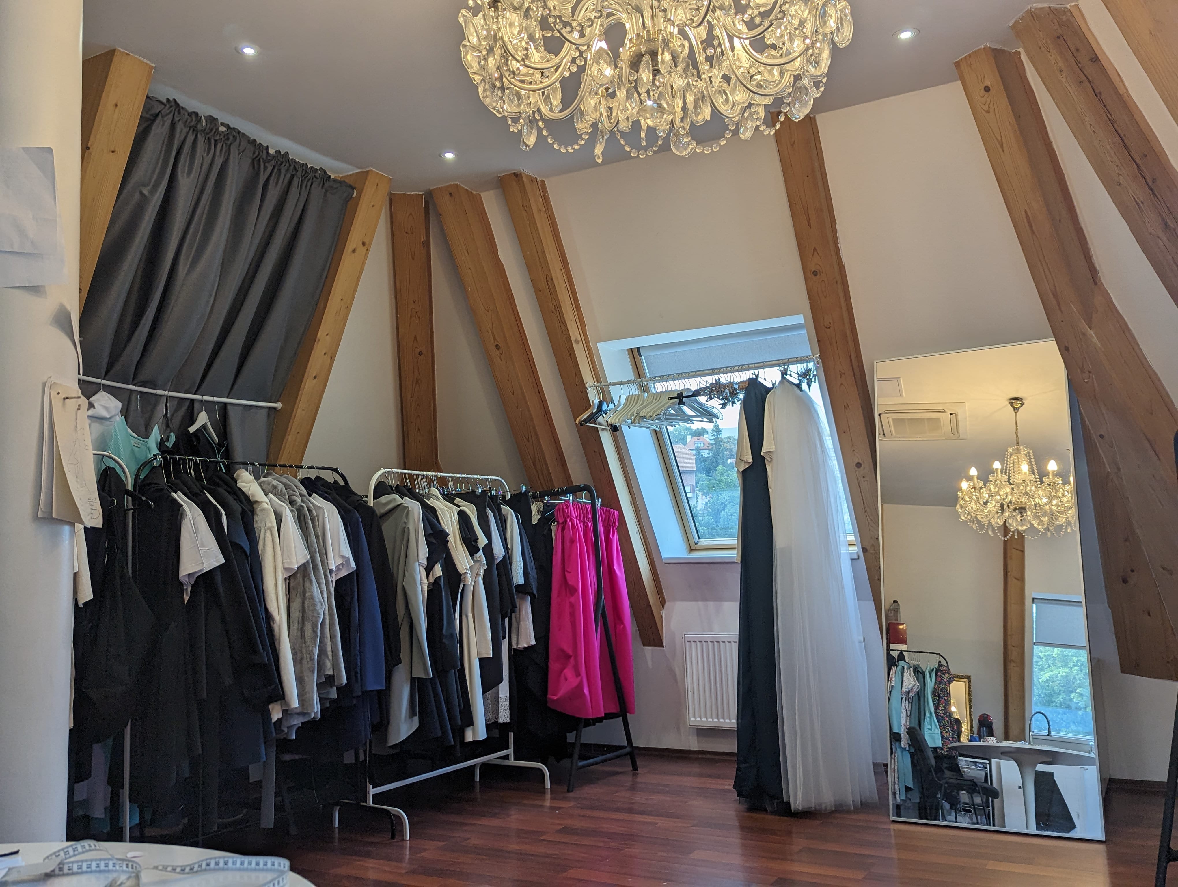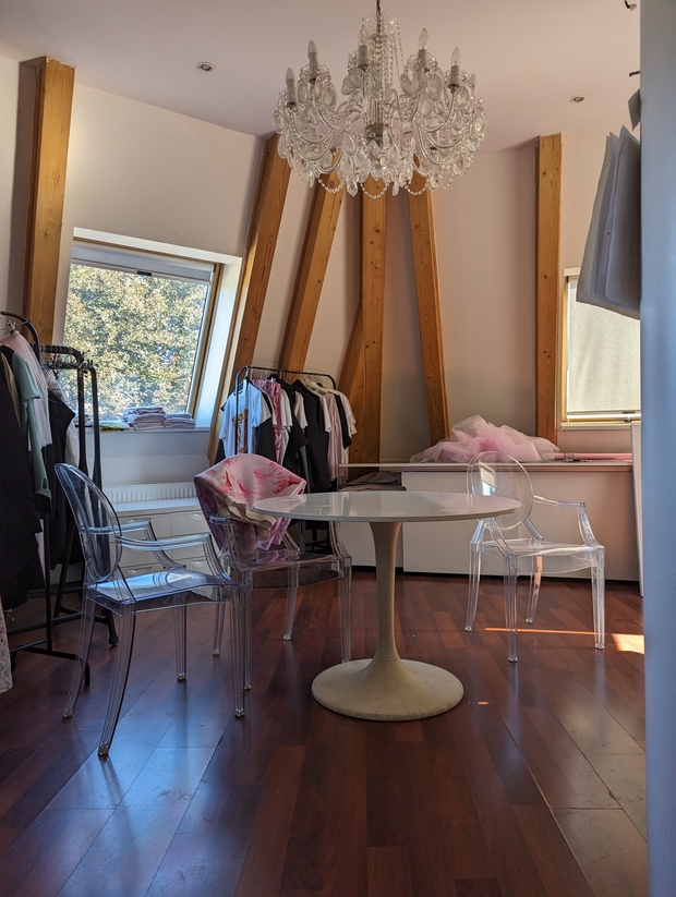 Jsem módní návrhářka, najdete mě na stránce luciemarkova.cz nebo Instagramu @lucie.markova. A co potřebujete vědět, že jsem tak trochu punk: nečekejte luxusní prostor a upjatou konverzaci, ale skutečné artové prostředí, kde tvořím svoje kolekce, modely od 350 Kč do desítek tisíc. Ateliér je ve třech patrech ve věži. Když přijdete, vyjedete nahoru výtahem, otevřu Vám dveře a nahoru se jde po točitých schodech. Mám tu svoje kresby, šicí stroje, látky, židle různých velikostí a tvarů, jeden gauč (nový🙂) a nahoře po střeše se dostanete z ateliéru na střešní terasu na věži, kde si můžete užít výhled na Prahu.