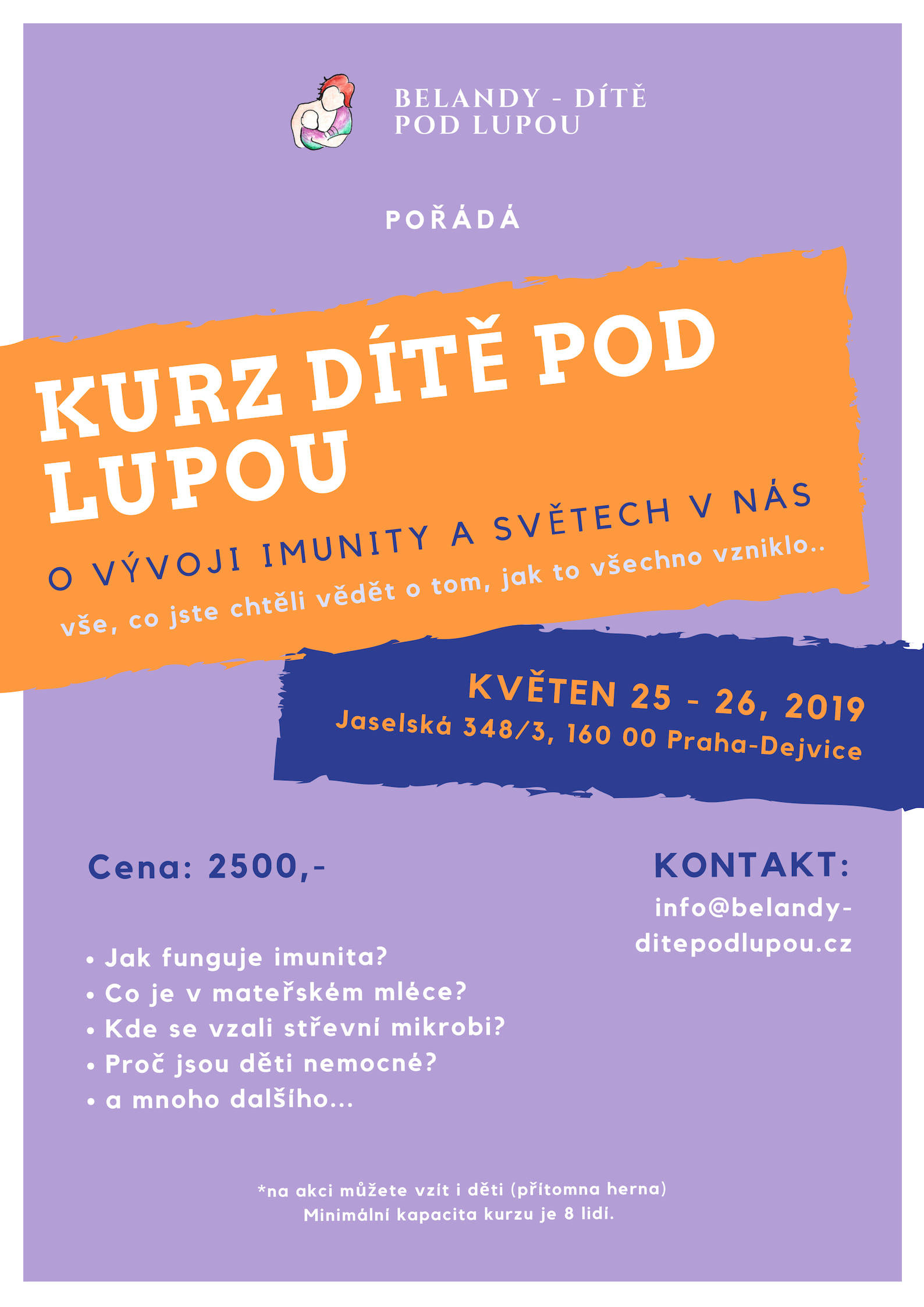 Kurz Dítě pod Lupou je plánován jako víkendový, na 1,5 dne. Ranní bloky budou probíhat od 9:00 do 12:00, sobotní odpolední blok bude probíhat od 13:00 do 17:00.