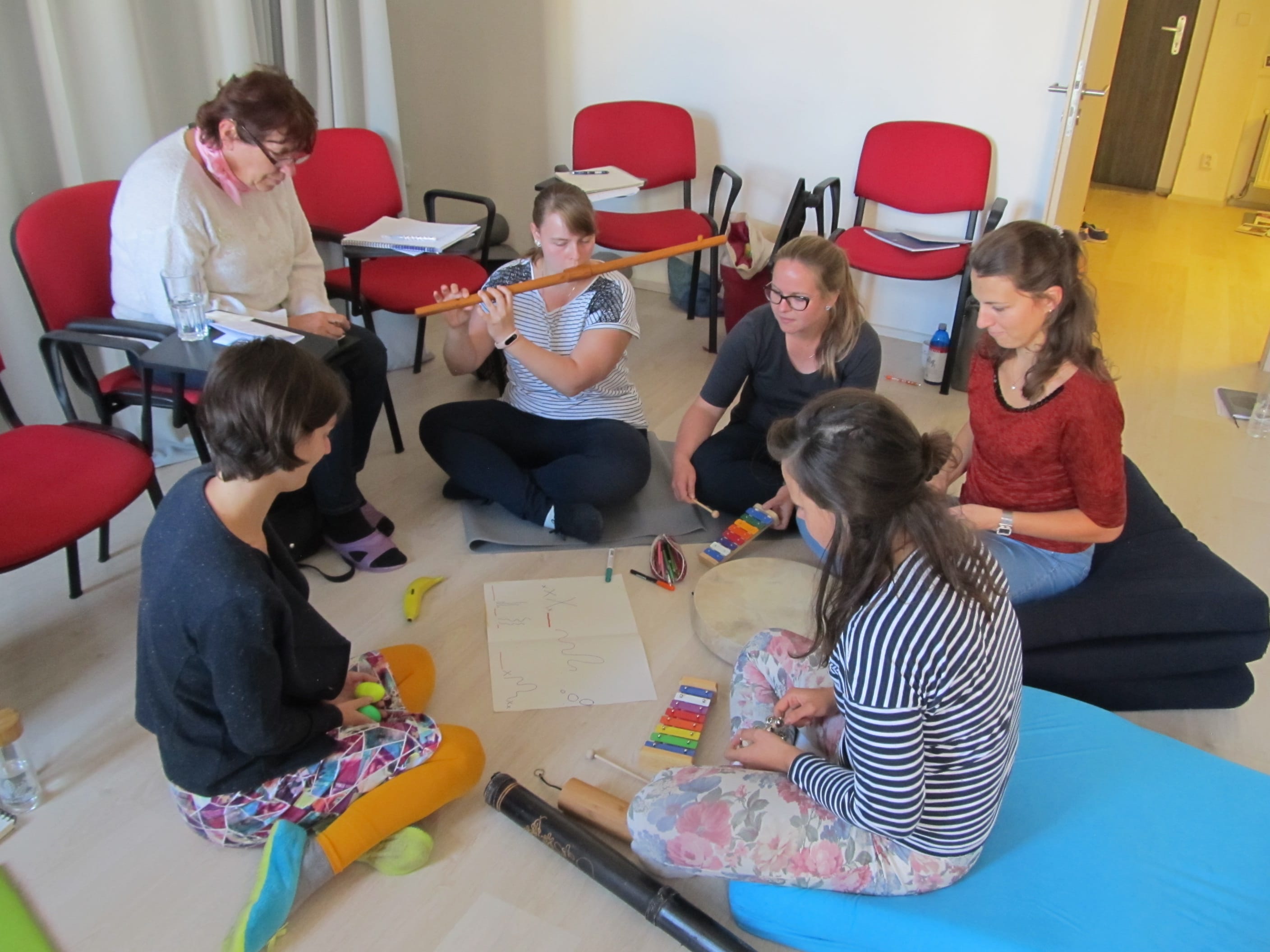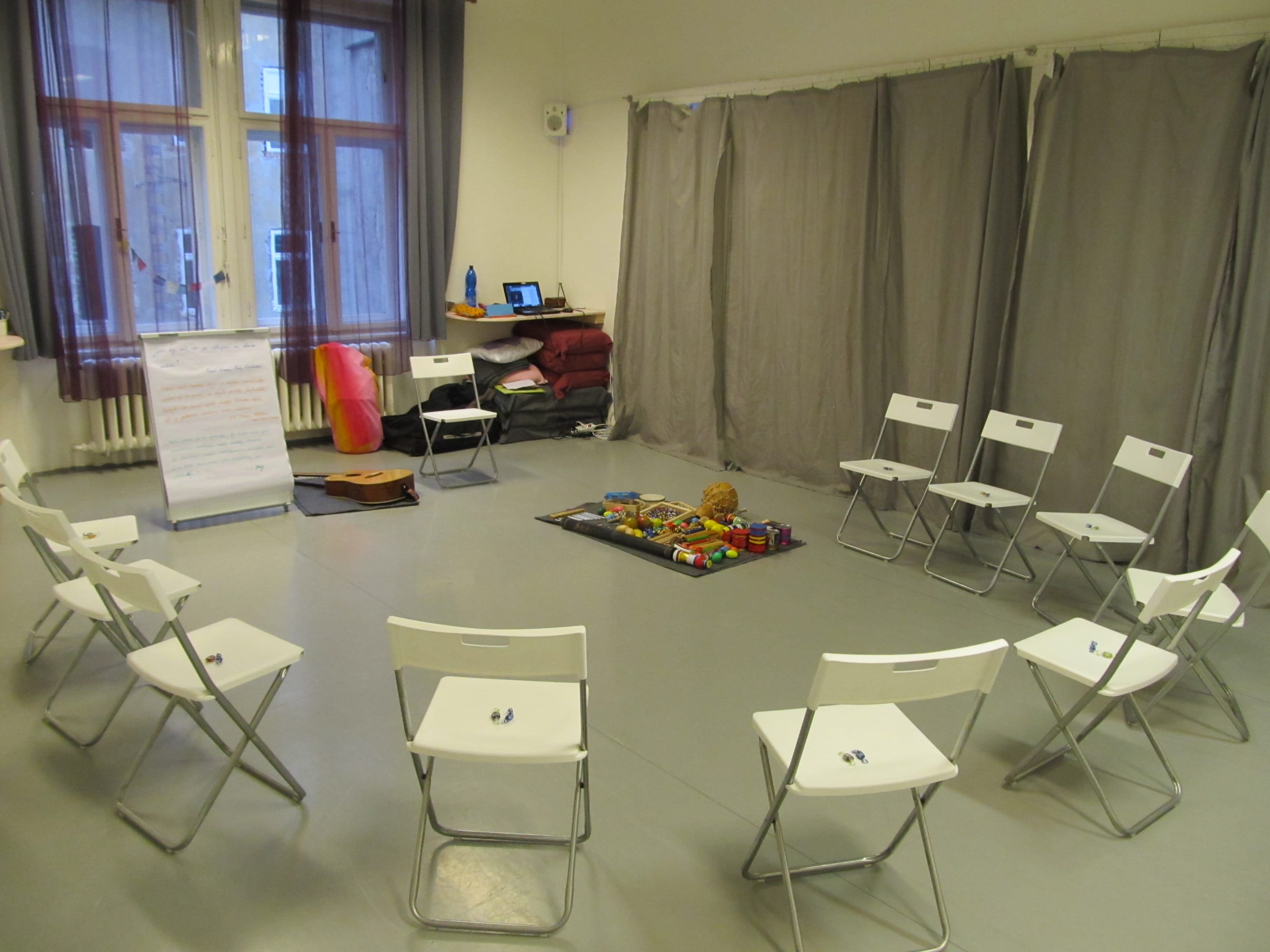 - Praktické ukázky, techniky muzikoterapie a hudební hry.