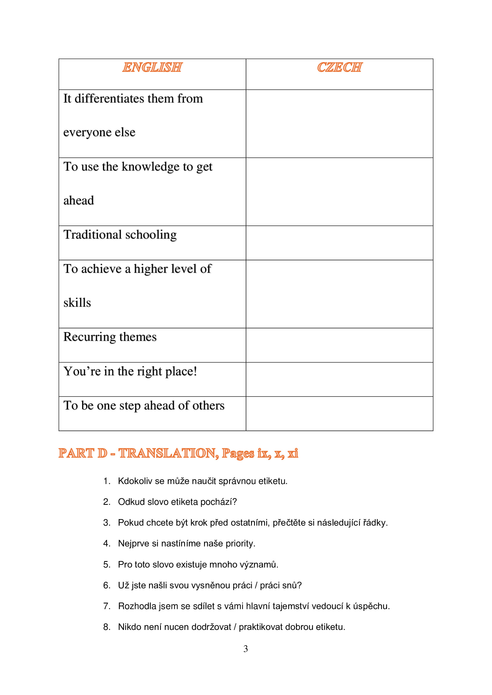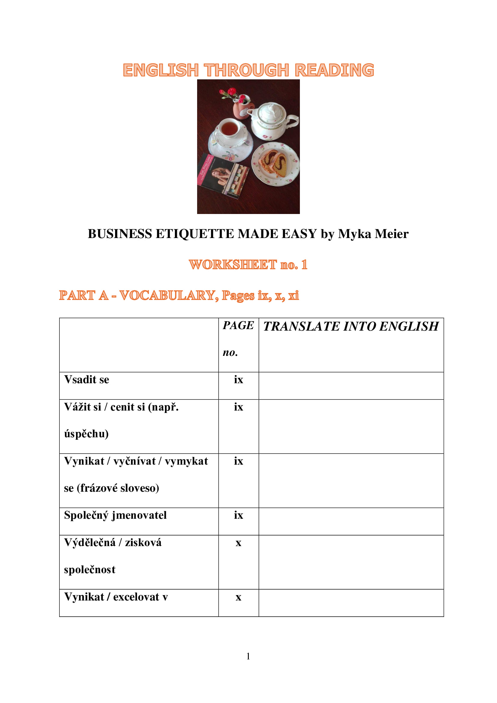 V samostudiu si budete číst z vybrané knihy o etiketě, vyhledáte si slovíčka, vypracujete worksheet a zašlete ho na můj email. Vše zkontroluji, veškeré zásahy do textu provedu v revizi oprav a budete tedy přesně vědět, kde došlo k úpravám. V případných komentářích navrhnu lepší variantu překladu a vysvětlím.