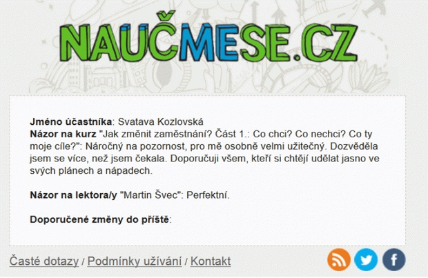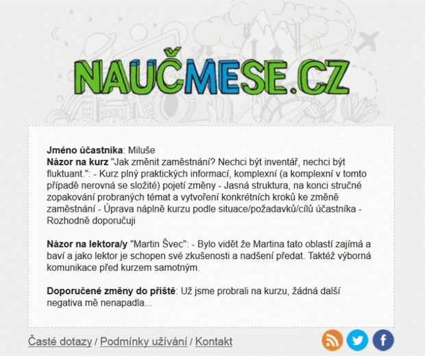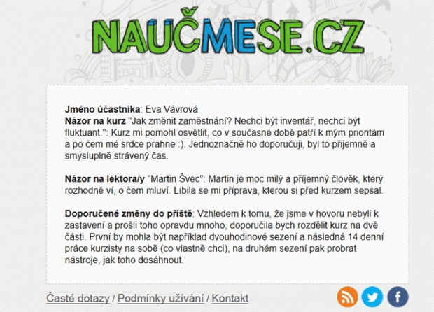 Martin měl kurz moc pěkně připravený. Také oceňuji jeho individuální přistup. O problematiku se zajímám déle, ale tím, že jsme zabrousili i do dalších příbuzných témat, jsem si opět rozšířila svůj pohled na věc.Kurz hodnotím určitě kladně. :-)