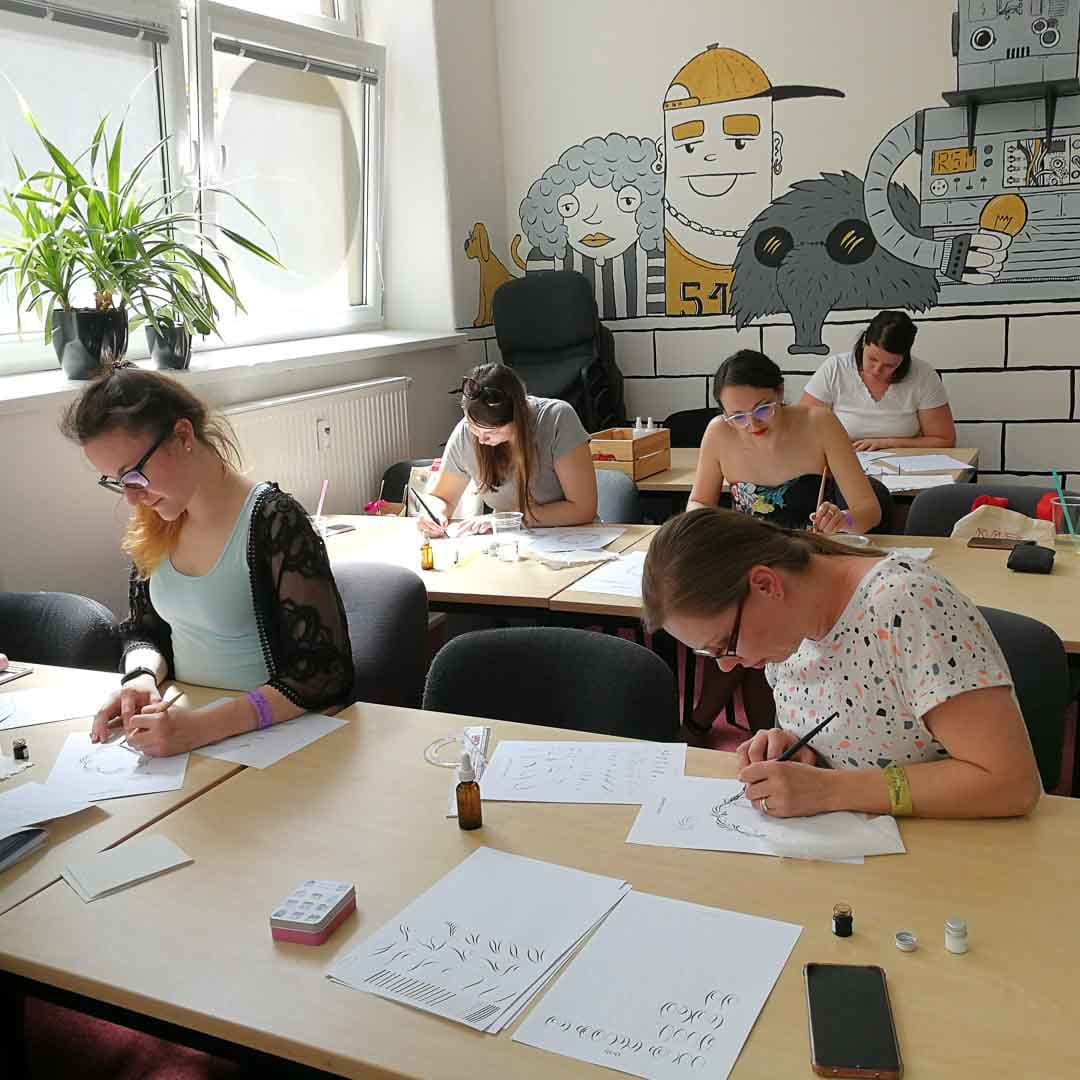 Studenti se mě často ptají na všelijaké ozdůbky, které písmo doprovází. Právě těmto ozdobám jsem věnovala workshop na Májovém Pa-peeru. Kudrlinky, kytičky, větvičky: rozebereme si je na příkladu zdobeného rámečku. Že s kaligrafií nemáte žádné zkušenosti? To vůbec nevadí, kurz zvládne i úplný začátečník! Nebude to jen suchá teorie, těšit se můžete na spoustu tvoření, barevných papírů a třpytivých inkoustů.