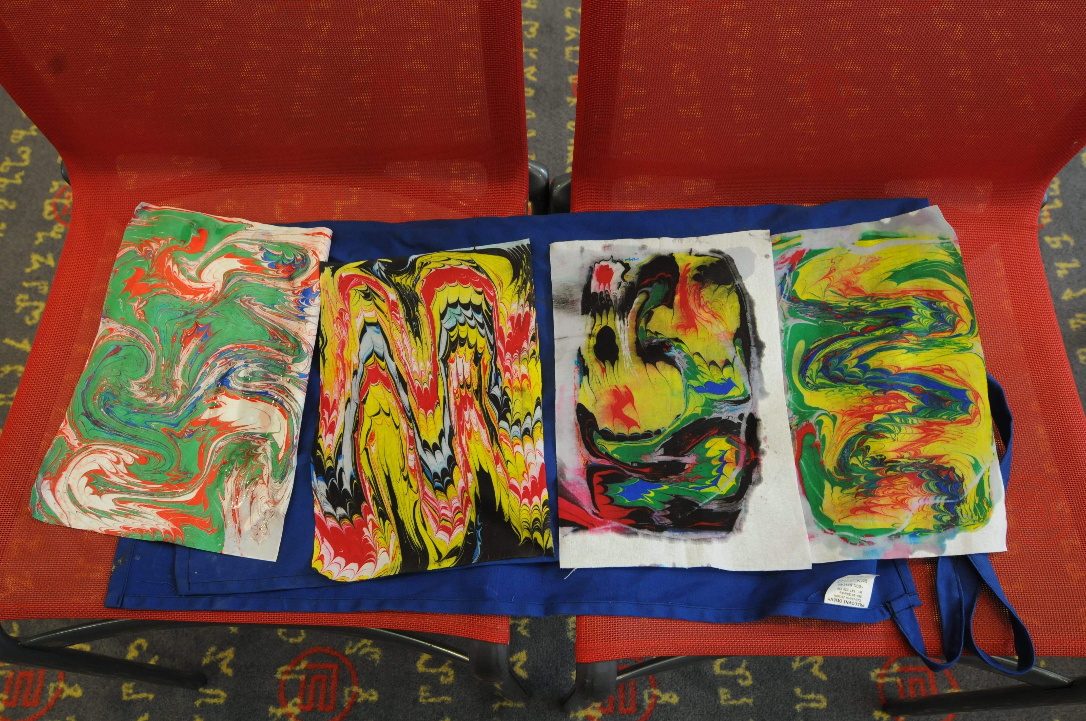 Po krátkém zaschnutí si můžete obarvenou látku vzít domů. Přežehlíte si ji a můžete ji dále použít, například jako aplikaci na textil, na výrobu peněženky, obálky knížky apod. Během naší dílny si vyzkoušíte více obrazů z vámi zvolených barevných kombinací.
