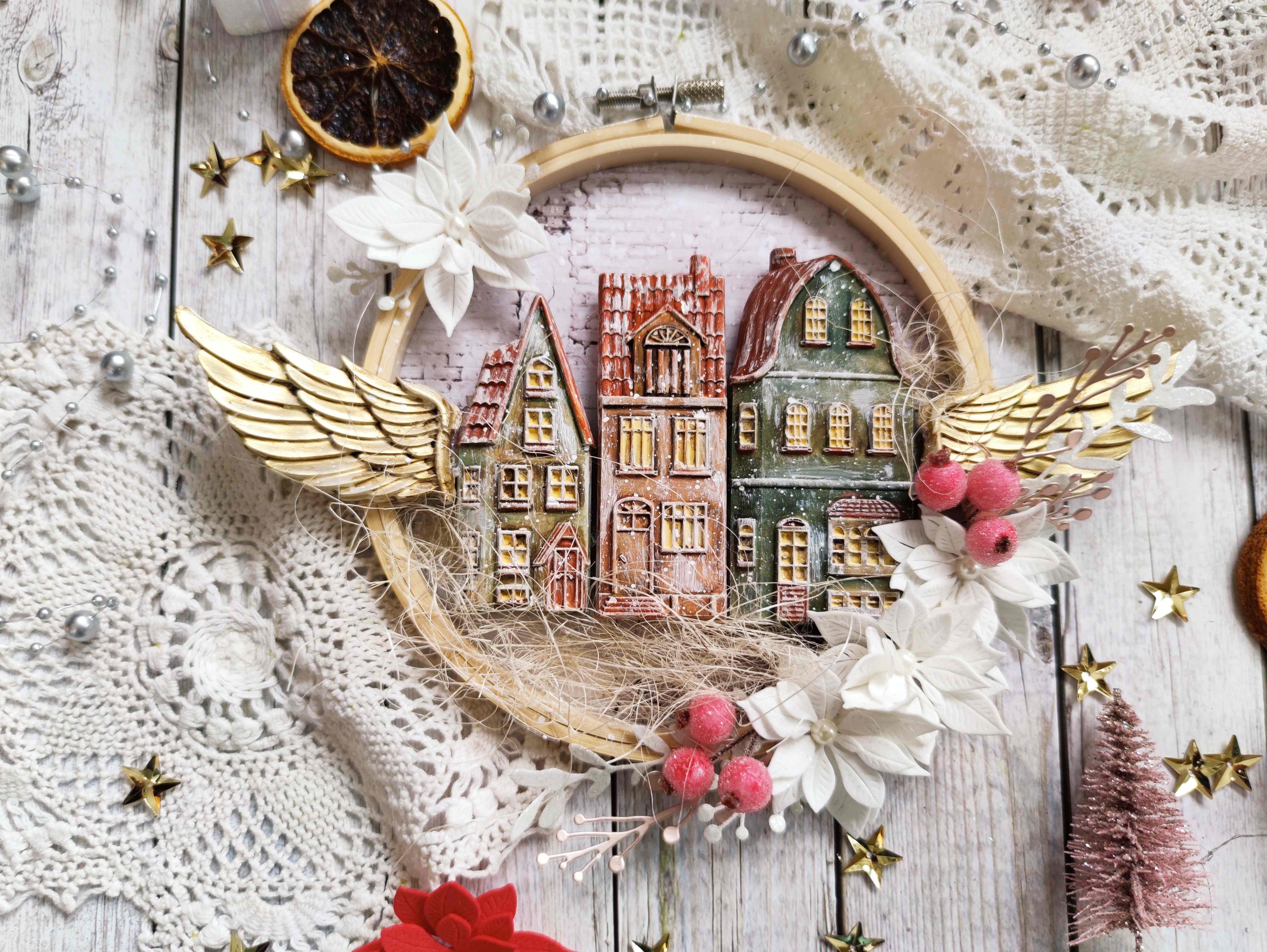 Výsledkem bude hotový obrázek v rámečku s motivem andělských domečků, připravený k zavěšení nebo darování.