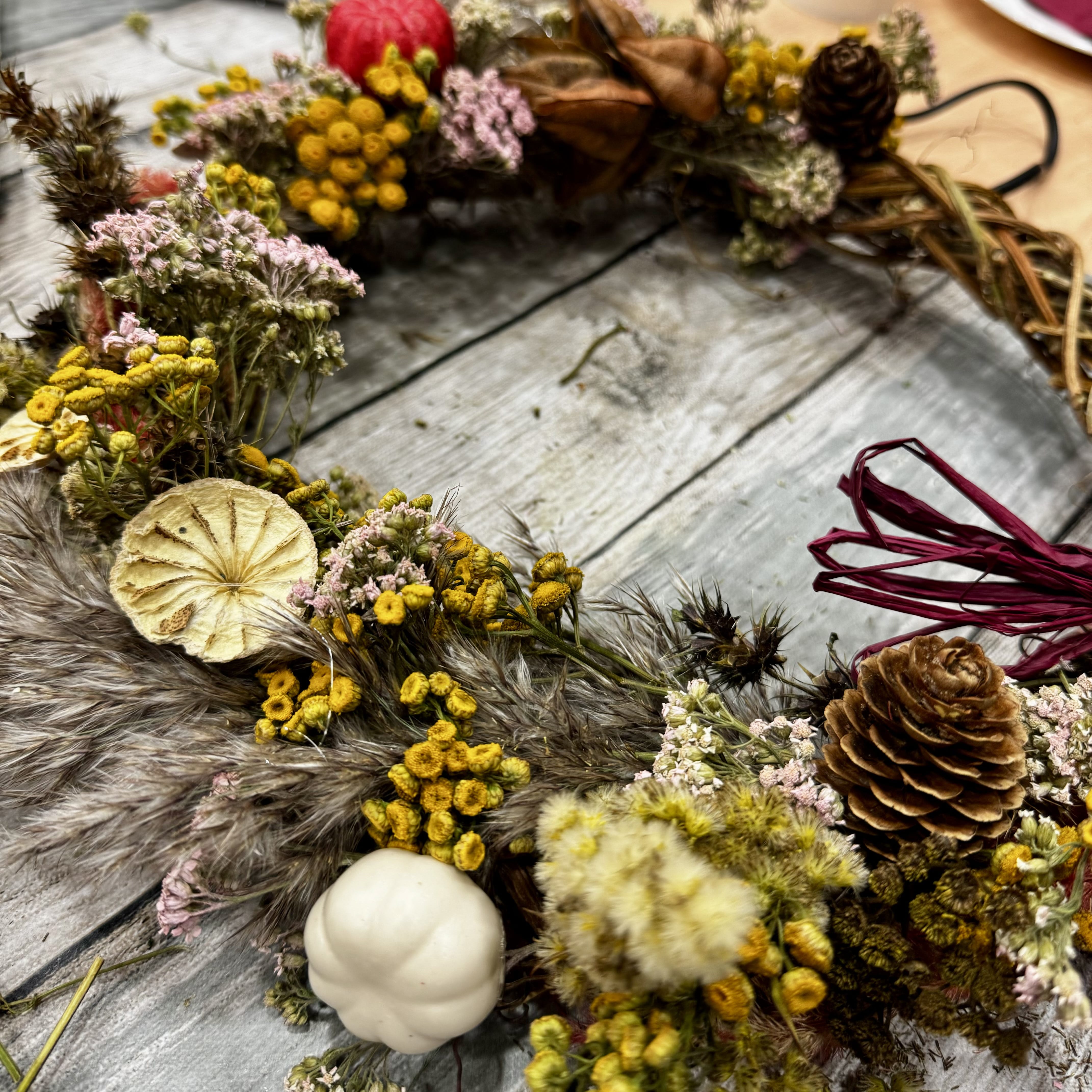 Přijď si vytvořit podzimní věnec dle svého vkusu do mého atelieru. Mám nastřádaný pestrý materiál, který můžeš použít!