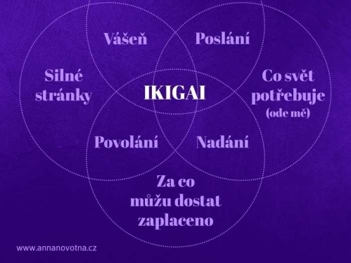 Téma Co je ikigai – 4 kružnice – životní filosofie naplněného smyslu života (práce je radost a uživím se tím)