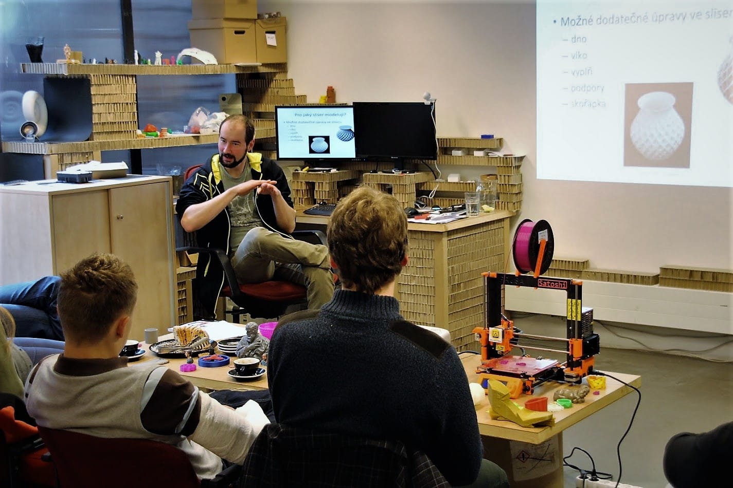 Na tomto třetím ze čtyř kursů jsme si prošli veškeré nastavení parametrů tisku v programu Slic3r. Lektoři také vysvětlili, co ty jednotlivé parametry znamenají. Forma vysvětlení byla srozumitelná, doma jsme pak už vše zvládli sami napoprvé. Toto hodnocení provádím asi po 1/2 roce.