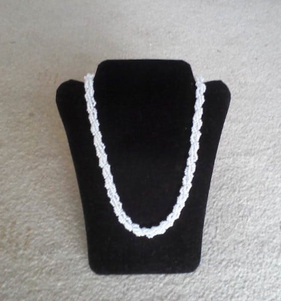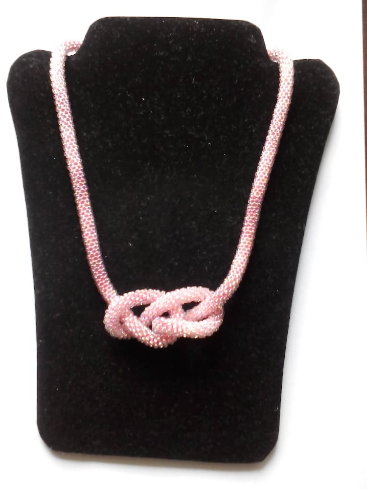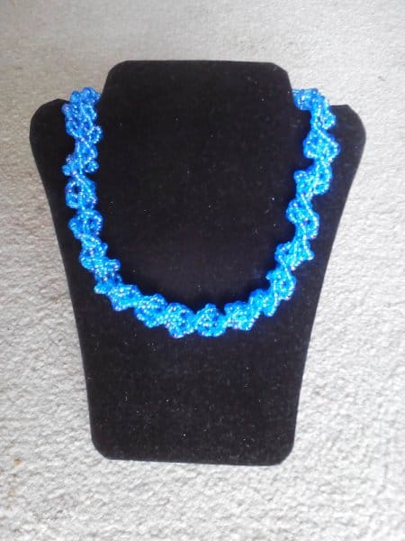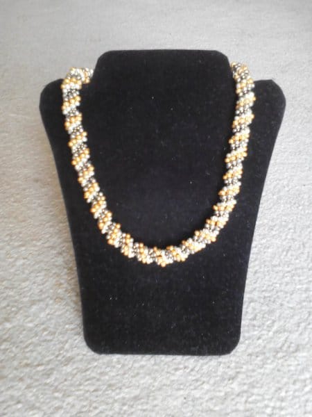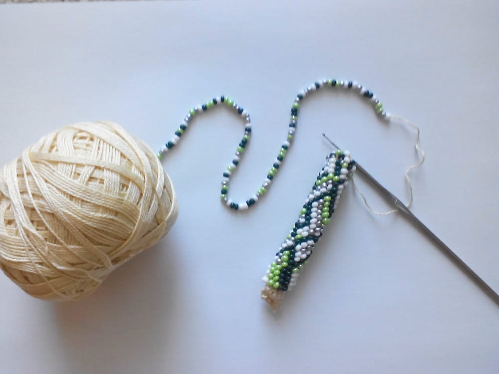 - háčkované korálkové náhrdelníky a náramky- tento kurz je levnější o 100,- Kč, peníze Vám vrátím v hotovosti na začátku kurzu. Naučíte se háčkovat dutinku s korálky technikou pevného oka i krátkých sloupků, zakončení sešitím i s použitím ozdobného kaplíku a zapínání. Naučím Vás číst schémata pro navlékání korálků za účelem výroby různých vzorů náhrdelníků, také si povíme, kde tato schémata na internetu najdete. Prozradím Vám triky co udělat, pokud Vám v návleku u pravidelného vzoru bude chybět nebo přebývat korálek, jak kontrolovat návlek u nepravidelného vzoru. Na poslední fotografii je ukázka rozpracovaného náramku háčkované dutinky se vzorem, na předchozích dvou fotografiích vidíte háčkovanou dutinku melírovanou; ukončení je pomocí kaplíku, dále je použito „americké zapínání“.