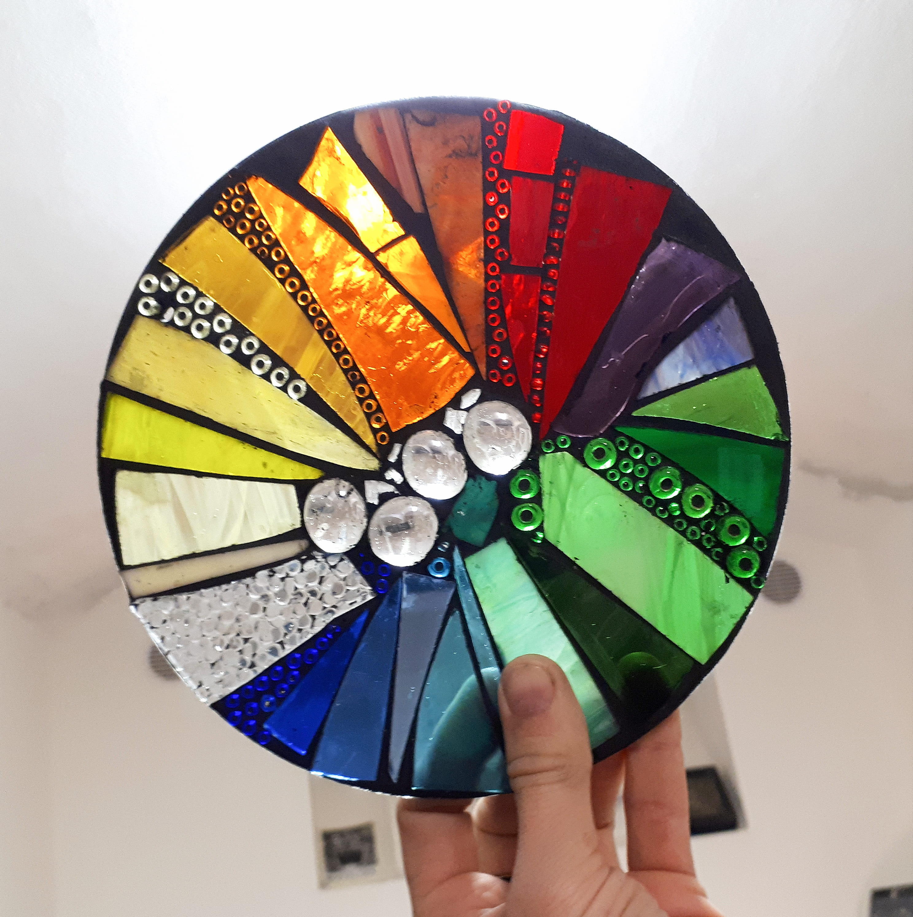 - technikou skleněné mozaiky si můžete ozdobit např. elektrickou hranatou lampu, lucernu, kruhový závěs/světlohru do okna, misku, rám zrcadla...