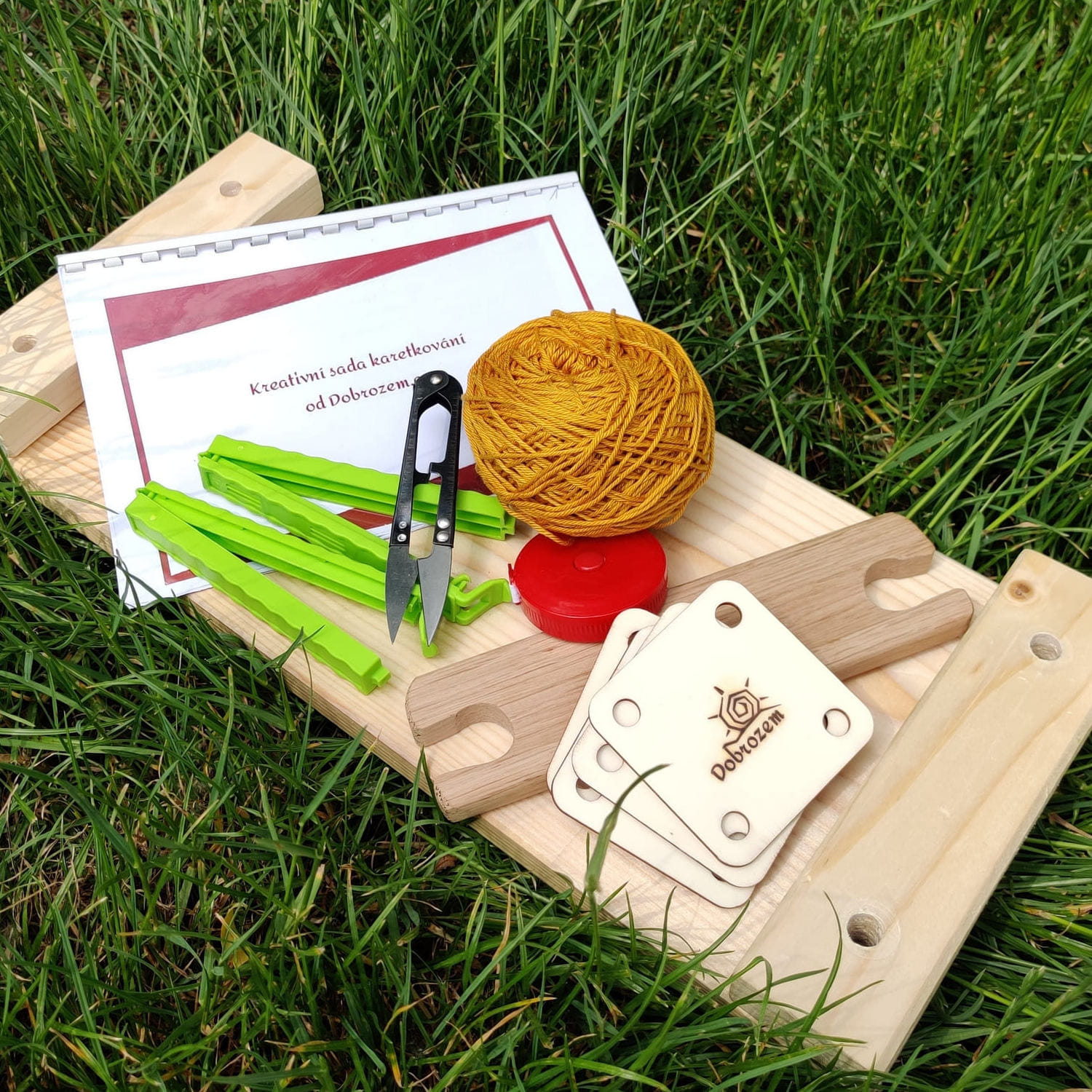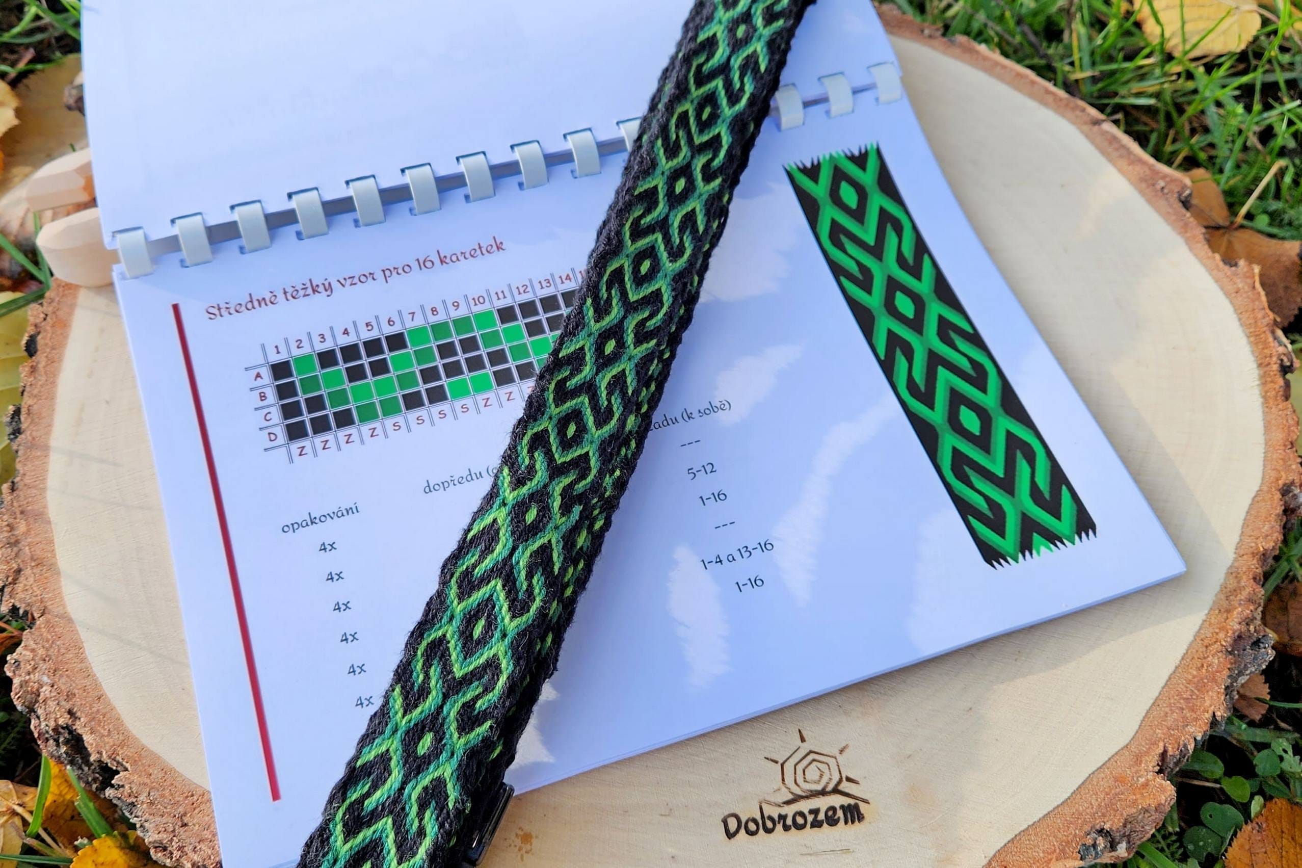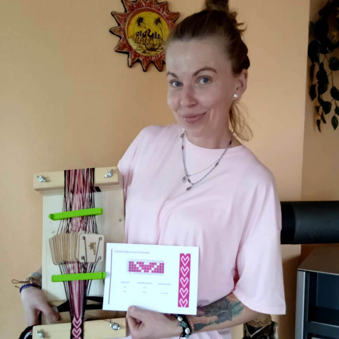 pomůcky pro tkaní a tištěný návod pro připomenutí postupů.