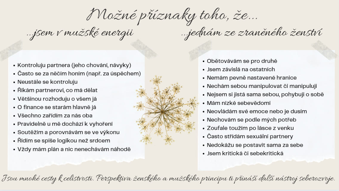 - dostaneš seznam možného jednání z mužské energie a zraněného ženství